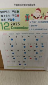 年末年始の診療スケジュールにつきましては、画像のカレンダーをご確認ください。